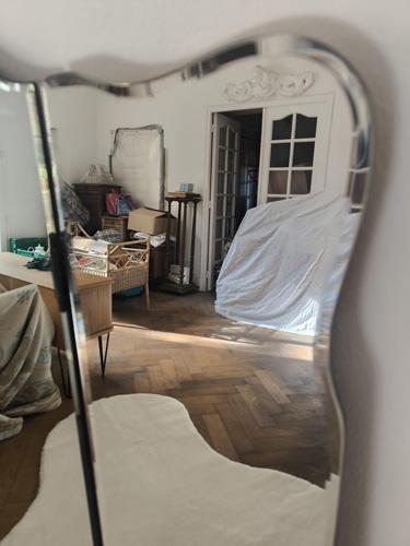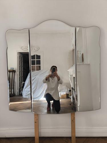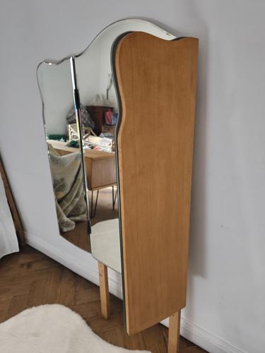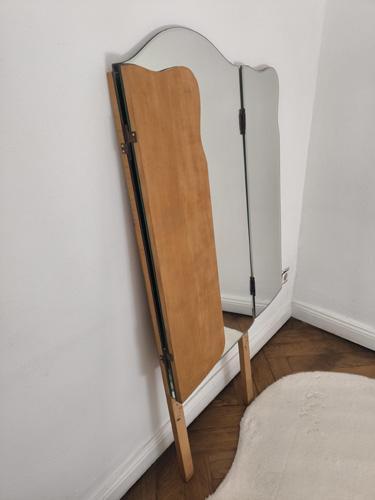 Miroir triptyque des année 1950, biseauté de forme typique de l’époque à fixer au mur.