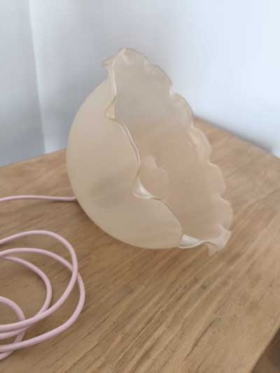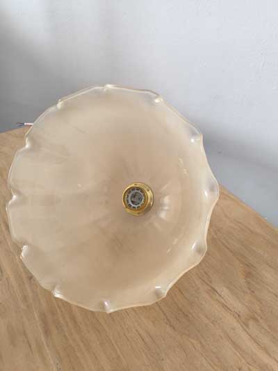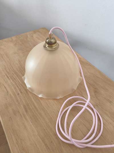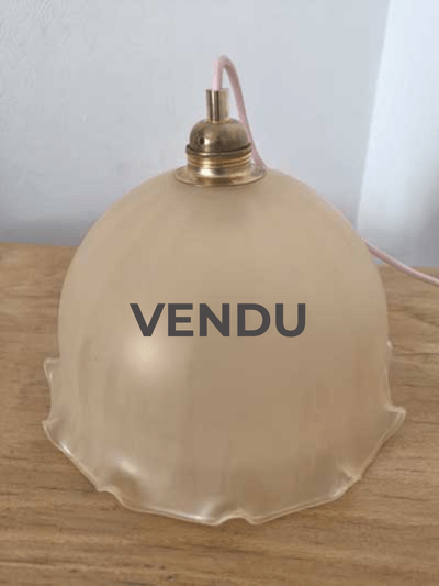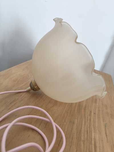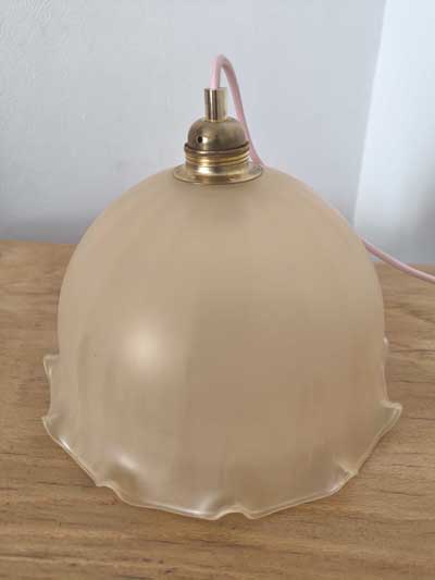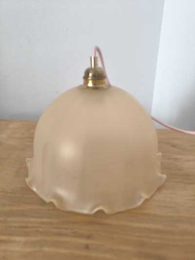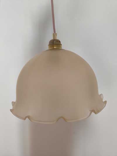 Suspension abat-jour vintage en opaline rose beige avec volant.